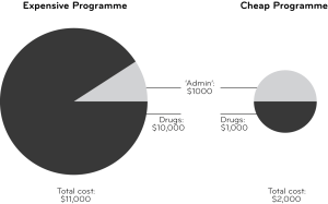 A more subtle problem is that it penalises charities which are cost-effective. Suppose Charity A hires doctors to work in less developed countries and buys equipment. It incurs some admin costs to secure and co-ordinate those resources. Suppose Charity B does similar work but gets doctors to volunteer and gets companies to donate the equipment. Pretty much the sole costs in Charity B are admin, but that’s because the other costs aren’t there – its model is cheaper. But if you only look at the admin costs as a percentage of the whole (small) cost base, Charity B would look awful precisely because it’s cheap. The admin percentage analysis fails because it doesn’t ask: “a percentage of what?”
