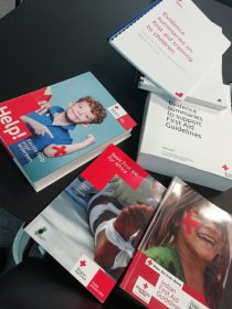 the picture shows its training manuals for first aiders, and the massive stack behind them is the systematic reviews and evidence summaries which underpin them. Its recent studies have looked at first aid responses to poisoning and to snake bites (separately!), and BRC-F has recently become the Cochrane centre on first aid. An example RCT that it is running is about methods for teaching first aid.