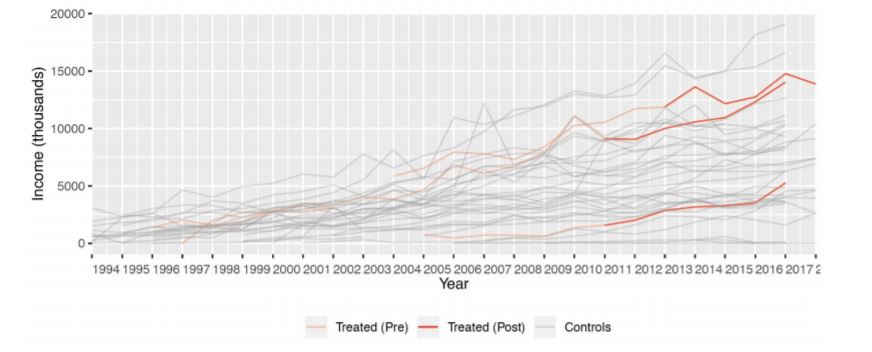 Below is the revenue of various UK air ambulances over ~20 years. It compares the revenue of those which got Royal patrons (in red) versus that of those that did not. (Air ambulances are one of several sets of ‘natural comparators’ that we used in our analysis.) Below that, we do the same for children’s hospices, some of which also started Royal patronages during the period of our financial data and most did not. The graphs for the other groups we analysed are similar.