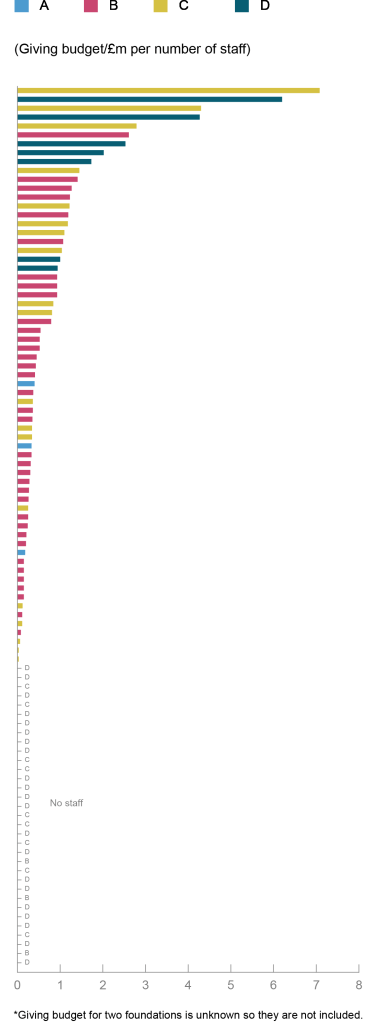 The graph below shows the range of giving budget per staff member, and each foundation’s overall rating.