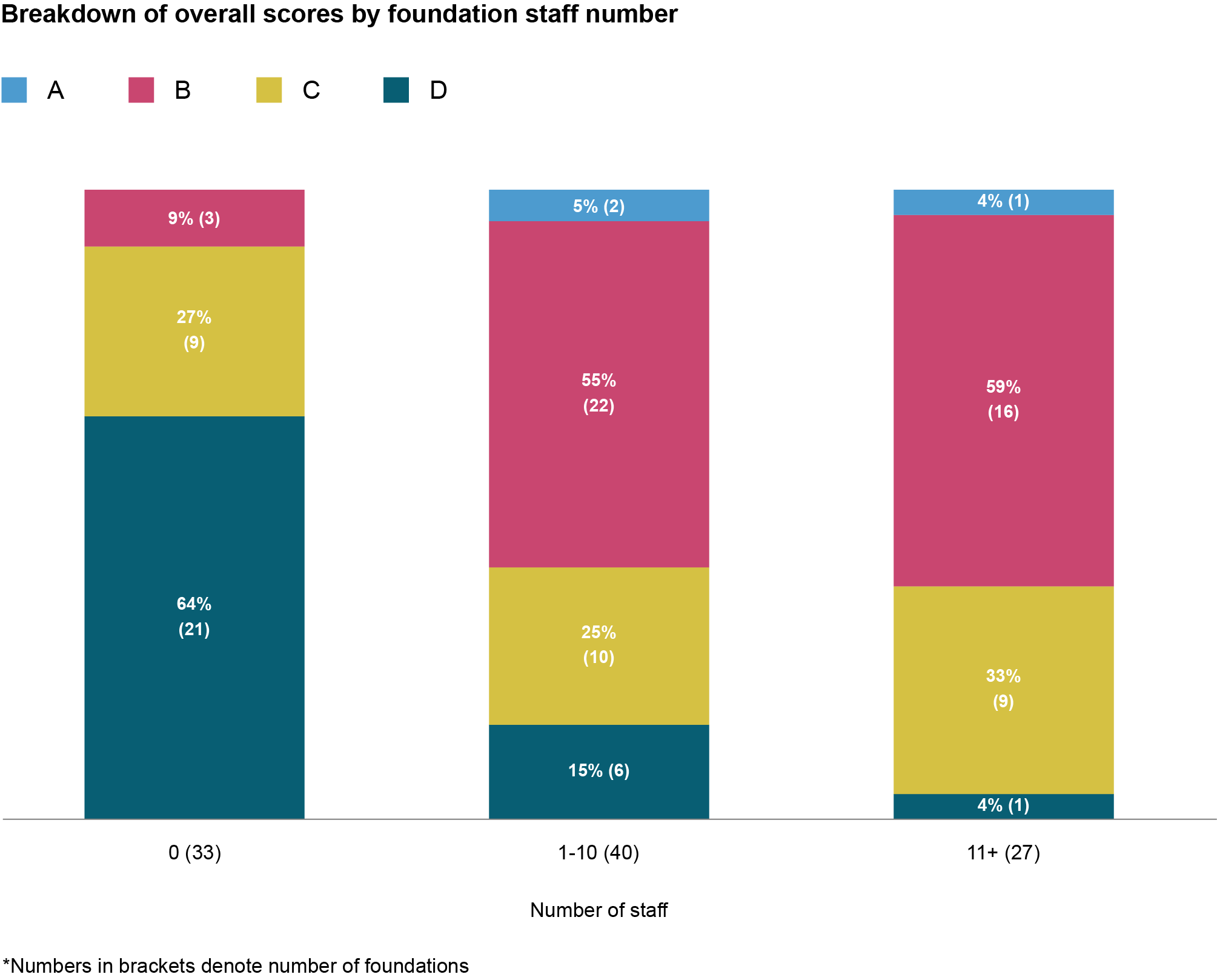 Nearly two-thirds of foundations with no staff scored the lowest grade of D. By contrast, of foundations with staff, only 10% scored a D. No foundation with more staff than 50 staff scored D.
