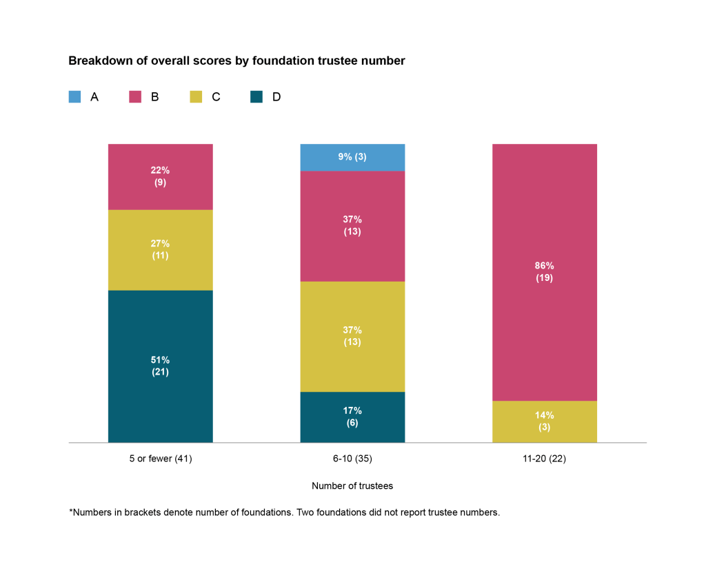 There is a similar pattern in the number of trustees. No foundation with more than 10 trustees scored D, and Ds were much more common among foundations with few trustees. The graphs below show the distribution of scores by a foundation’s number of staff (left), and its number of trustees (right).